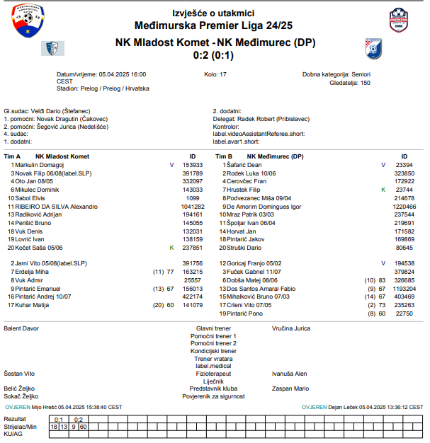 –Odigrali smo dosta dobru utakmicu i nemam što zamjeriti svojim igračima. Imali smo svoje šanse i u prvom i drugom dijelu ali zakazala je realizacija. Protiv ekipe kao što je Međimurec ako ne zabiješ iz jedne ili dvije šanse gol, a mi smo ih imali više, onda ne možeš računati na bodove. Čestitam protivniku na pobjedi a mi se okrećemo sljedećem kolu gdje idemo po bodove– Davor Balent, trener momčadi iz Preloga.