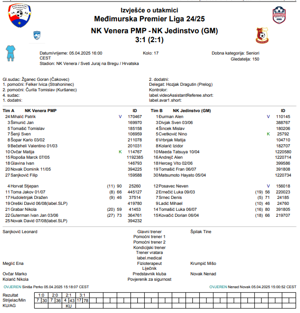 Pobjedom na domaćem terenu Venera je prekinula loš rezultatski niz ovog proljeća. Domaći su s dva pogotka Šenjija, prvi je zabio u 30. a drugi u 36. minuti došli do dobre zalihe pred odmor. Međutim, gosti koriste kazneni udarac u 43. minuti i golom Šinceka vraćaju utakmicu u neizvjesne vode. Venera je tri boda osigurala u 78. minuti kada pogodak zabija Hudoletnjak.