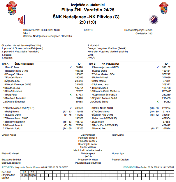 U još jednoj utakmici dva pogotka bila su dovoljna za pobjedu. Nedeljanec je ugostio Plitvicu i pobjedom zasjeo na treće mjesto. Žganec zabija za vodstvo domaćih u 28. minuti, dok golom Medveda u 68. Nedeljanec osigurava sva tri boda. Iskoristili su domaći poraz Jalžabeta i preskočili ih na ligaškoj ljestvici.
