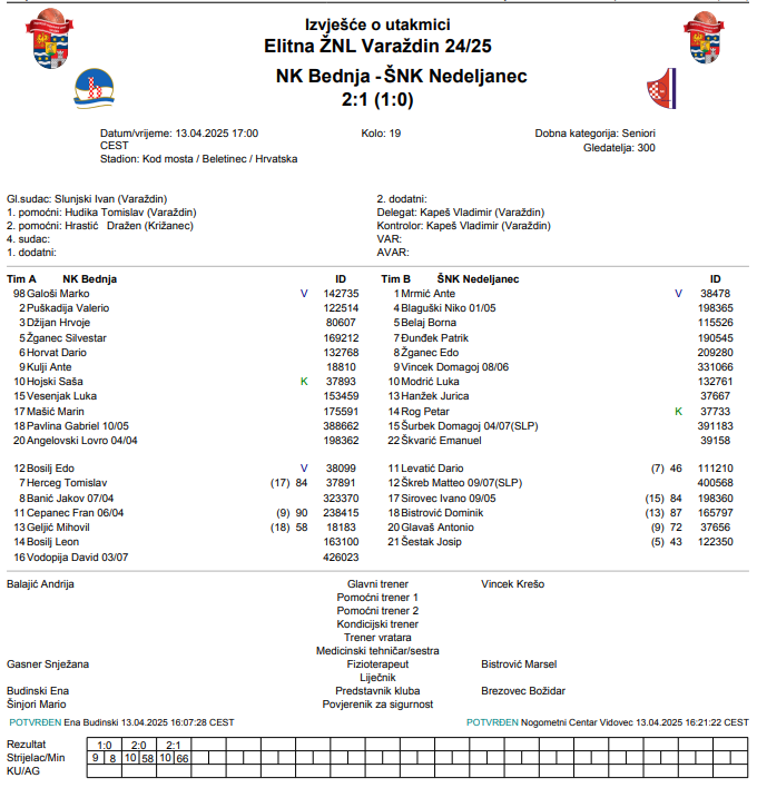 Bednja nastavlja sigurno ka putu prvaka Elitne lige. Ovoga puta bili su bolji do dobre momčadi Nedeljanca na domaćem terenu. Već u 8. minuti domaći dolaze u prednost, a pogodak zabija Kulji. Hojski zabija u 58. minuti za 2:0. Pogodak koji je gostima dao nadu zabija Modrić u 66. minuti, ali gosti dalje od toga nisu mogli.