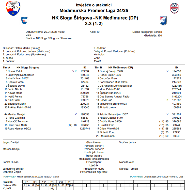 –Hm tekma..loše smo ušli, sve kontra dogovora. Poklonili prvi gol, bili prvih 15 minuta indisponirani totalno. Da su gosti otišli na 0-3 bilo bi zasluženo. Nekako smo se golom Šoštarića uspjeli vratit se u igru. Na poluvremenu smo probali smirit tenzije, smirit strasti i mogu pohvalit ekipu za 2. poluvrijeme. Bili smo dobri, imali smo svoje šanse i na kraju zasluženo osvojili bod, bilo bi bezobrazno reci 3 boda jer nakon lošeg ulaska u tekmu i protiv tako dobre ekipe možemo biti zadovoljni. Hvala gostima na fer i korektnoj igri i našim navijačima na navijanju, mada smo ih skoro opet razočarali– Danijel Jagec, Sloga Štrigova.