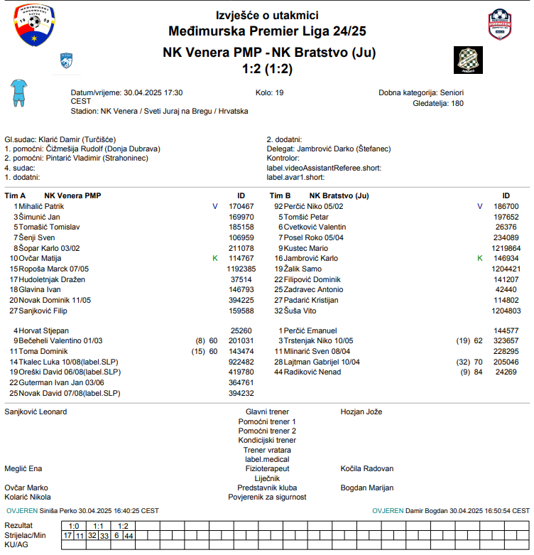 –Zaslužena tri boda protiv mlade i poletne momčadi NK Venere. Znali smo da nas čeka težak susret. Svi smo odigrali na vrhunskom nivou iako su nam falila tri igrača. To je taj put kojim želimo ići, prema sredini tablice. Čeka nas paklen tempo, polufinale kupa gdje se želimo dobro pripremiti i proći u finale. Želim zahvaliti navijačima i da nas prate i dalje– Nenad Radiković, NK Bratstvo (Ju)