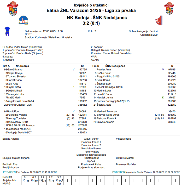 –Pravi derbi koji je ponudio svu ljepotu nogometa. Nakon propuštene tri velike šanse u prvih 15 minuta protivnik nas kažnjava i pogotkom Modrica dolaze u vodstvo. Do kraja poluvremena stvaramo puno šansi, puno opasnih prilika međutim niti jednu ne koristimo. Početkom drugog poluvremena Modrić fantastičnim udarcem pogađa same rašlje i dovodi Nedeljanec u vodstvo 2:0. Ali moja momčad po tko zna već koji put pokazuje karakter i radi preokret. Nismo se predavali nego smo konstantnim napadima vršili pritisak i nastavili stvarati šanse. To je jednostavno moralo uroditi plodom. Mihovil Geljić u razmaku od 3 minute postiže 2 pogotka i dovodi nas do izjednačenja i osvajanja prvenstva tri kola prije kraja. Ali niti tu nismo stali nego smo težili i trećem pogotku. I u samoj sudačkoj nadoknadi u 95 minuti protivnik ruši našeg igrača u 16 metara i sudac svira jedanaesterac. Svojim trećim pogotkom Geljić nas vodi do pobjede i zasluženog slavlja. Čestitke gostima na fer i korektnoj igri, a mi idemo proslaviti osvajanje prvenstva i pripremiti se za srijedu i prvu finalnu utakmicu kupa protiv Varteksa– Andrija Balajić, NK Bednja.