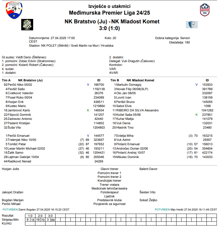 – Znali smo da nas čeka teška utakmica protiv izravnog konkurenta za ostanak u ligi. Zaslužili smo mukotrpnim radom, kako igrača na treninzima tako i radom uprave 3 boda danas. Hvala svima, zaslužili smo ostati u ligi. Sada nam slijedi zaostala utakmica 19. kola sa Venerom u srijedu koja je otkazana radi tragične smrti našeg prijatelja Nikole Pokrivača– Radiković Nenad, NK Bratstvo (Ju)