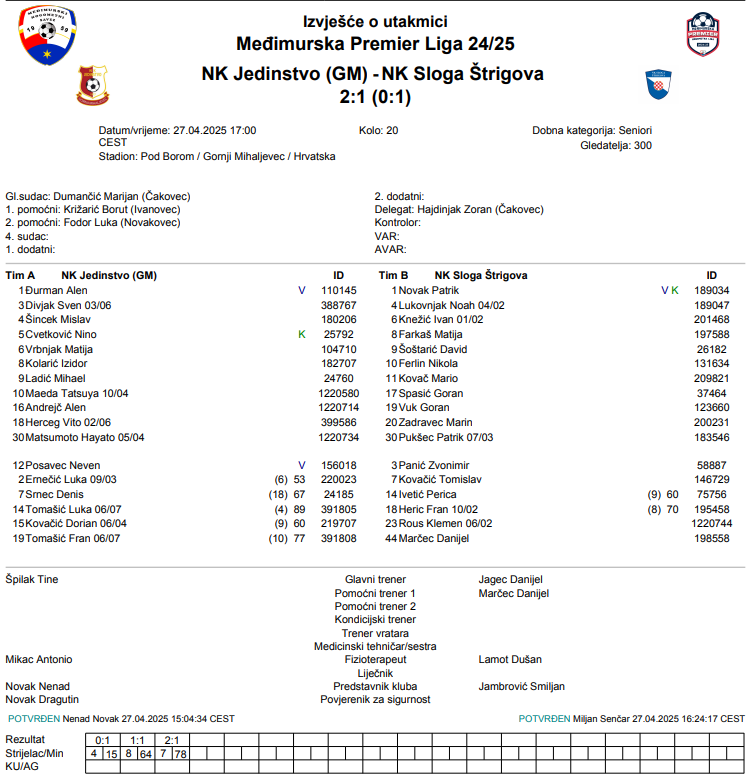 –Dobro ušli u tekmu, brzo poveli 0-1 bili dominantni, dobri prvo poluvrijeme. Čak smo mogli zabit još koji gol. Na poluvremenu smo se dogovorili da, nastavimo sa svojom igrom, da se nametnemo posjedom jer nam domaćin nije mogao parirati u tome. Imalo smo prečku, 5, 6, 7 situacija da povećamo rezultat i onda iz jednog centaršuta dobili gol. Ušli smo u neki grč, strah i nismo bili pravi. Dobili smo gol opet iz centaršuta. Očito smo se zamjerili lopti! Iz dobivene utakmice izgubimo iz dva centaršuta bodove! Čestitke domaćinu na pobjedi! Mi moramo posložit neke stvari, jer iz jedne ekipe koja je imala najbolju obranu uz Međimurec, smo krenuli u krivom smjeru. Trebamo se čim prije resetirat i vrati na pobjedničke staze– Danijel Jagec, NK Sloga Štrigova.