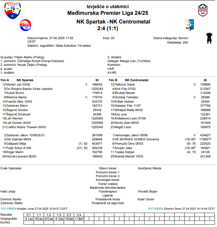 –Prvo poluvrijeme je stvarno bilo dobro s naše strane, dobra energija, taktički dobro stajali, zabili gol, imali još dvije situacija i onda nesmotrena reakcija u 45 minuti nakon njihovog kornera, tu smo ih vratili u utakmicu. Drugo poluvrijeme prvih 20 minuta dobro, odlazimo na 3:1 i opet loša reakcija obrane prilikom jednog centaršuta. Nakon toga smo energetski pali, reagirali smo sa zamjenama i donijeli su nam potrebnu energiju da pred sam kraj utakmice zabijemo na 4:2, čestitam mojim dečkima. Moram reći da prilikom pripreme utakmice ekipa Spartaka nije zadnjih tri tekme bila na razini što se tiče energije, danas su bili stvarno dobar protivnik, želim im sreću u narednih 6 kola– Nikola Goričanec, trener momčadi NK Centrometal.