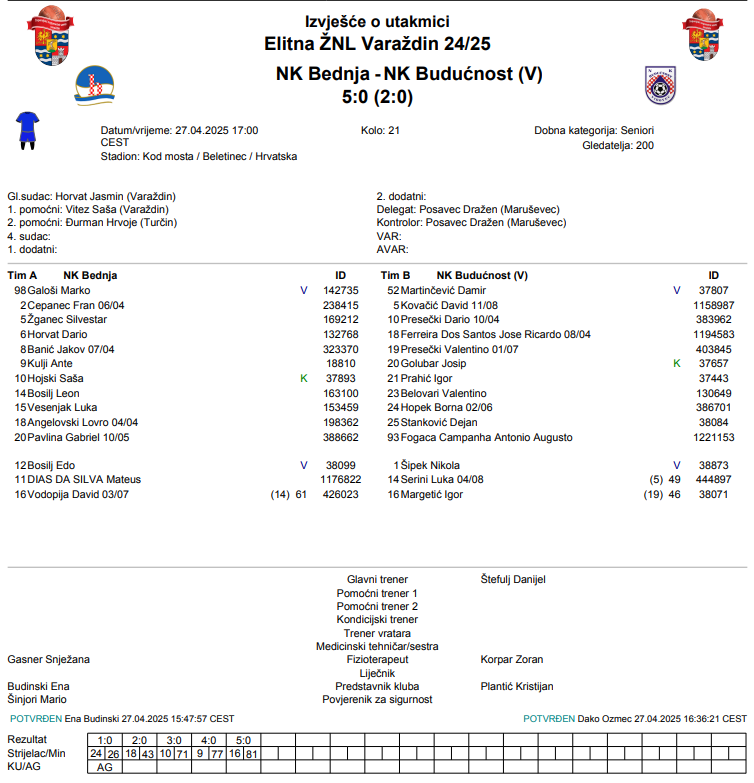 –To je bila jednosmjerna utakmica bez obzira što nam je nedostajalo 5 standardnih igrača. Ali veseli me to sto svi koji su danas igrali su opravdali povjerenje. Jer kada vam 3 pogotka postignu igrači od 18 i 20 godina onda se Bednja ne treba bojati za budućnost– Andrija Balajić, trener momčadi NK Bednja.