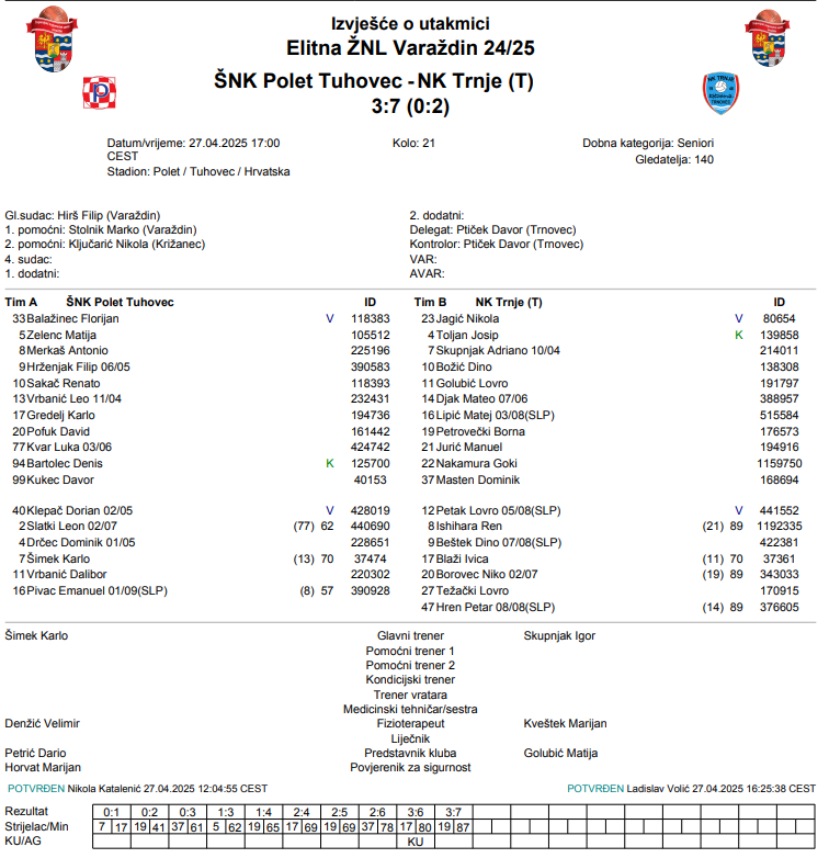 Nesvakidašnje visok rezultat i pobjeda Trnja na gostovanju u Tuhovcu. Do poluvremena gosti su imali prednost od 0:2, a zabijali su Skupnjak i Petrovečki. Masten zabija za 0:3, a pogodak koji domaće koliko toliko vraća u susret zabija Zelenec u 62. minuti. Drugim golom Petrovečkog Trnje se vraća na tri gola prednosti. Još jednom domaći smanjuju rezultat, ovoga puta pogodak zabija Gredelj za 2:4. Hattrickom Petrovečkog rezultat glasi 2:5 u 69. minuti utakmice i postaje jasno kako će domaći jako teško i do boda. Sve nade domaćima gasi Masten golom za 2:6 u 78. minuti i ovo je već debakl za Polet. Treći pogodak Polet zabija s bijele točke, a egzekutor je Gredelj. Konačnih 3:7 postavlja Petrovečki i utakmicu završava s 4 pogotka na svom kontu.