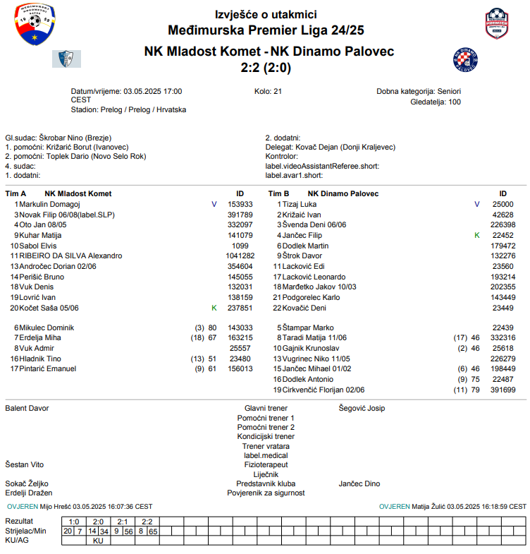 21. kolo Međimurske Premier lige započelo je susretima u subotu. Mladost Komet je na domaćem terenu ispustila prednost od dva pogotka protiv Dinama (P) i na kraju upisuje tek bod.