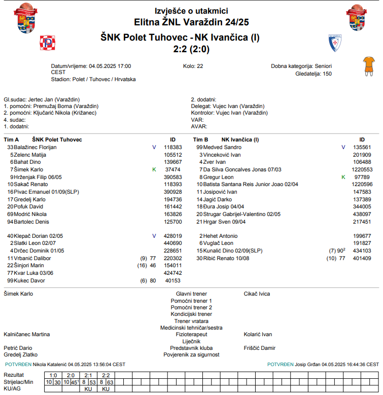 Susret momčadi srednjeg dijela ljestvice odigran je u Tuhovcu gdje je domaći Polet dočekao Ivančicu. Domaćin jako dobro otvara susret i s dva pogotka prednosti odlazi se na predah. Međutim, sve ono što je gradio prvih 45 minuta, Polet je prokockao u nastavku. Dva gola gosti zabijaju s bijele točke i susret završava remijem 2:2 i podjelom bodova.