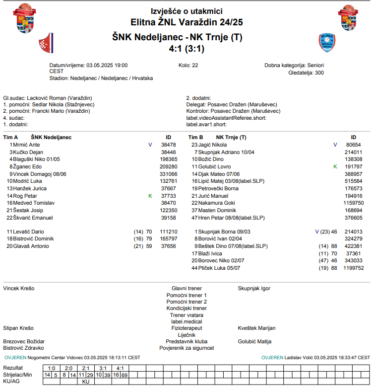 Momčad Nedeljanca iskoristila je poraz Razvitka i pobjedom na domaćem terenu zasjela na drugu poziciju. Domaće u vodstvo dovodi Rog u 5. minuti, a 9 minuta kasnije Žganec povećava vodstvo na 2:0. Golubić s bijele točke u 29. minuti vraća Trnje na jedan pogodak zaostatka. Domaći još jednom odlaze na dva gola prednosti ovoga puta pogotkom Modrića iz 39. minute. Konačnih 4:1 postavlja Medved u 69. minuti.