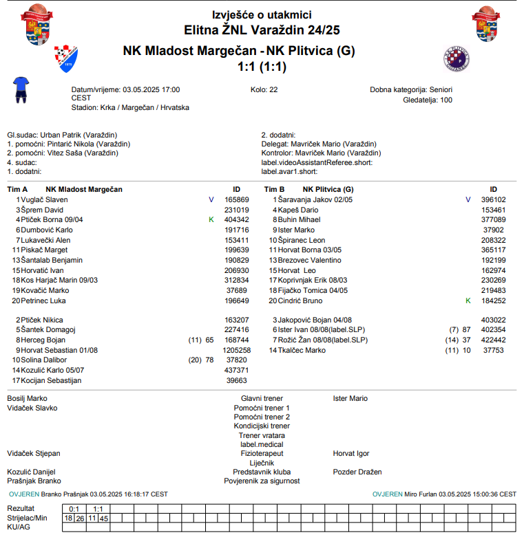 Susret momčadi dna ljestvice odigranom u Margečanu završen je bez pobjednika. Plitvica je došla do prednosti, pogodak za goste zabio je Fijačko u 26. minuti. Poravnanje domaćima osigurava Piskač u finišu prvog poluvremena. Obje momčadi sada imaju po 20 bodova, ali Mladost s nešto boljom gol razlikom nalazi se poziciju iznad.