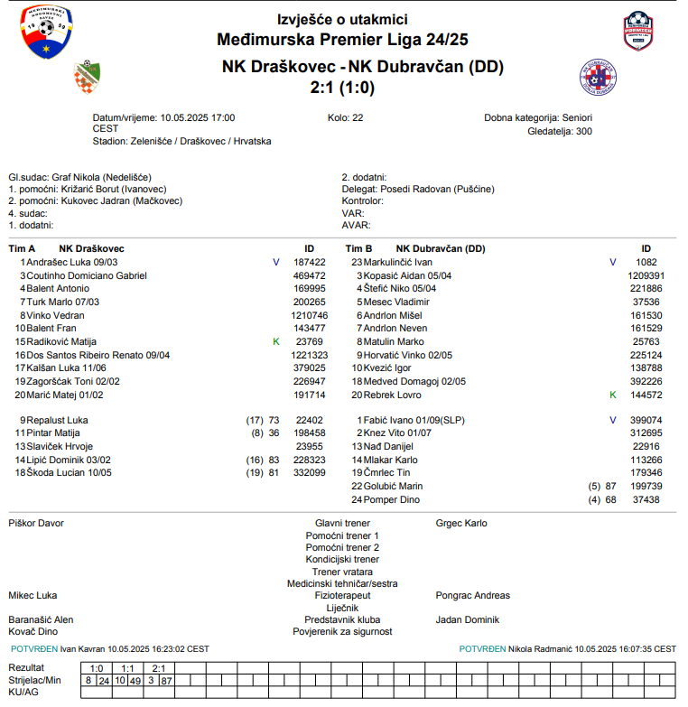 Pobjedom na domaćem terenu, Draškovec je prekinuo niz od tri poraza. Poveli su domaći golom Vinka u 24. minuti susreta. Ubrzo nakon početka drugog dijela, gost iz Donje Dubrave poravnava. Gol za goste zabija Kvezić. Pobjedu i 3 boda Draškovcu osigurava u 87. minuti Coutinho Domiciano, koji zatim zarađuje i drugi žuti karton.