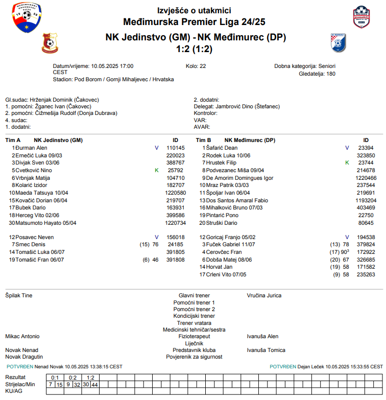 – Međimurec je bio puno bolji u prvom poluvremenu, gdje su stvorili nekoliko prilika, ali ih nisu iskoristili. Dvije naše pogreške omogućile su gostima da povedu 0:2. U zadnjih 5 minuta odlično smo reagirali i smanjili na 1:2 te preko Bubeka imali veliku priliku povećati na 2:2. U posljednjoj minuti dogodila se jedna sumnjiva situacija, ali sudac nije dosudio jedanaesterac. Drugo poluvrijeme odigrali smo odlično, bili smo agresivni i odlučni u duelu. Stvorili smo nekoliko prilika i trebali smo izjednačiti. Gosti spretno dolaze do minimalne pobjede na kraju– Tine Špilak, NK Jedinstvo (GM).