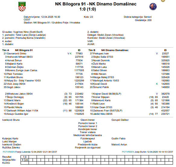 Trener Dinama Domašinec, Dalibor Gorupić: „Čestitam domaćinu na pobjedi. Iskoristili su našu individualnu pogrešku. Mislim da smo mi danas odigrali jednu jako dobru utakmicu – u najmanju ruku smo zaslužili bod. Malo sam se pribojavao današnje utakmice; u srijedu smo se fizički i psihički potrošili i ispraznili – tada je najteže igrati.