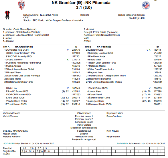 Trener Graničara (Đ), Mario Vodanović: „Odigralo smo stvarno jednu vrlo dobru utakmicu, posebno prvo poluvrijeme – izvanredno prvo poluvrijeme. Mogu samo čestitati svojim igračima jer smo sve što smo se dogovorili prije utakmice, to smo na terenu i prezentirali. Vrlo rano smo poveli s dva gola prednosti, što je, naravno, stvorilo izazov za gostujuću ekipu. Nakon toga su gosti dobili crveni karton, a mi smo zabili za 3:0. To je stvarno bilo jedno poluvrijeme iz snova.