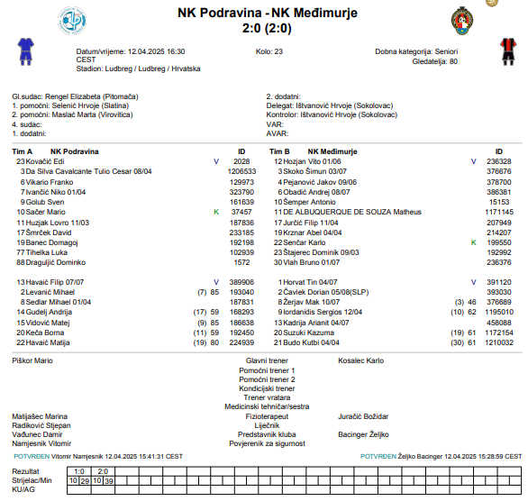 Trener Podravine, Mario Piškor: „Nismo odigrali neku bajnu utakmicu, ali smo bili bolji za ta dva gola. U drugom poluvremenu smo se malo uljuljkali i nismo iskoristili neke prilike, ali najvažnije je da smo utakmicu mirno priveli kraju. Čestitam dečkima što su grizli od prve minute i nisu podcijenili protivnika.“