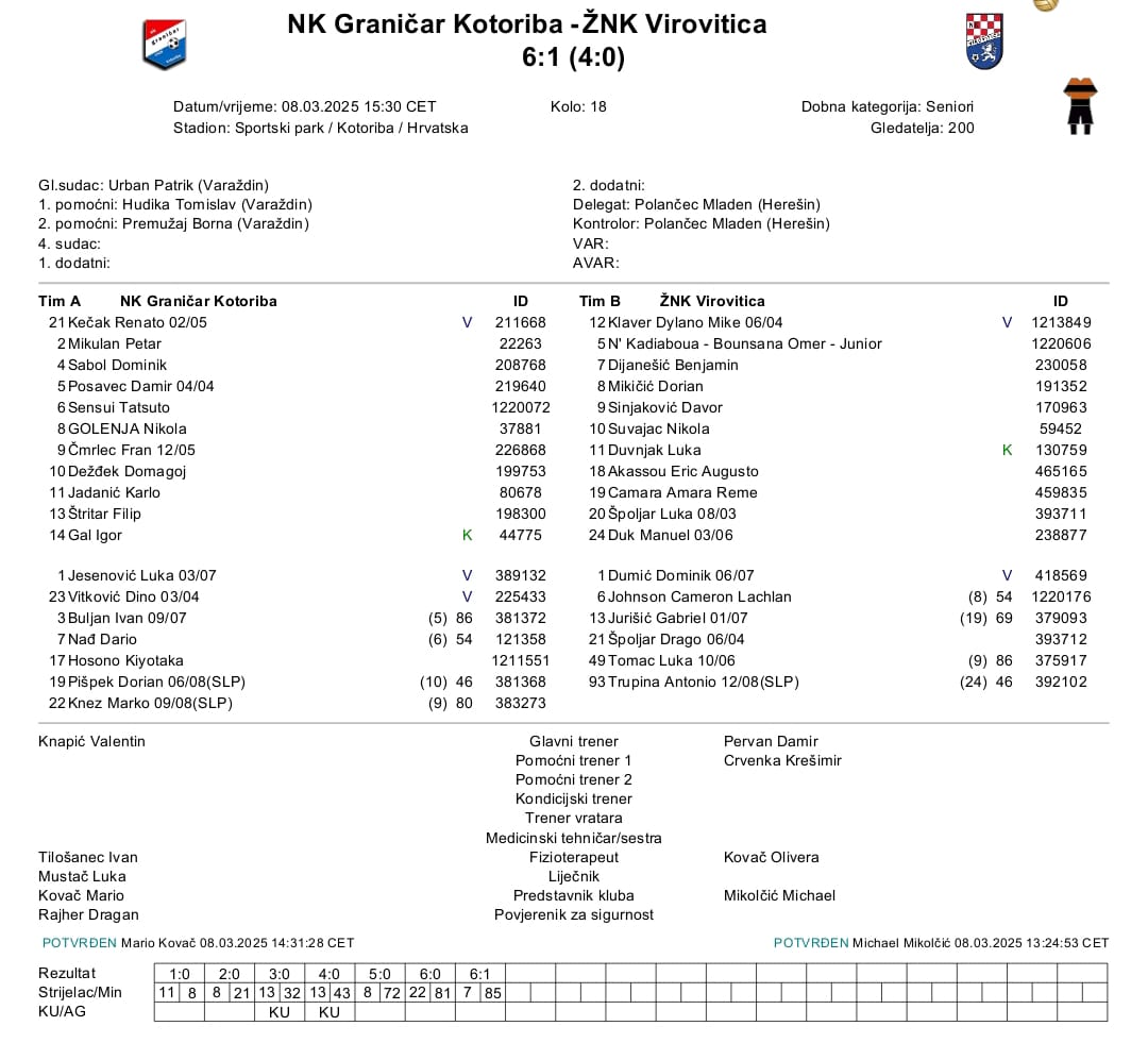 Virovitica ima svojih problema, a to su iskoristili momci iz Kotoribe koji su šest puta zatresli mrežu vratara Klavera. Nakon osam minuta popustila je virovitička obrana, a prvi pogodak postigao je Karlo Jadanić. Do poluvremena mrežu su tresli i Golenja te Filip Štritar, koji je postigao dva gola. U drugom poluvremenu tempo je pao, a domaćini su još dva puta zatresli mrežu – Golenja je zabio drugi put, a Marko Knez se također upisao u strijelce. Počasni pogodak za goste postigao je Benjamin Dijanešić u 85. minuti.