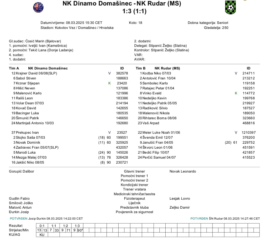 Rudar je nanio Dinamu Domašinec prvi poraz u 2025. godini. Gosti su bolje ušli u dvoboj i poveli u 13. minuti preko Silvija Radikovića. No, domaći se vraćaju u 33. minuti nakon pogreške u obrambenoj liniji gostiju, a kapetan Krznar poravnava rezultat. Trener domaćih nije bio zadovoljan igrom pa je promijenio sustav igre, a nakon toga su domaći izgledali bolje na početku drugog dijela. Ipak u 71. minuti gosti ponovno dolaze do prednosti. Igrač s klupe, Fran Janušić, matirao je dinamovog vratara Krajnera. Domaći se nisu uspjeli vratiti iz tog zaostatka, a u sudačkoj nadoknadi Janušić je drugim pogotkom potvrdio pobjedu Rudara.