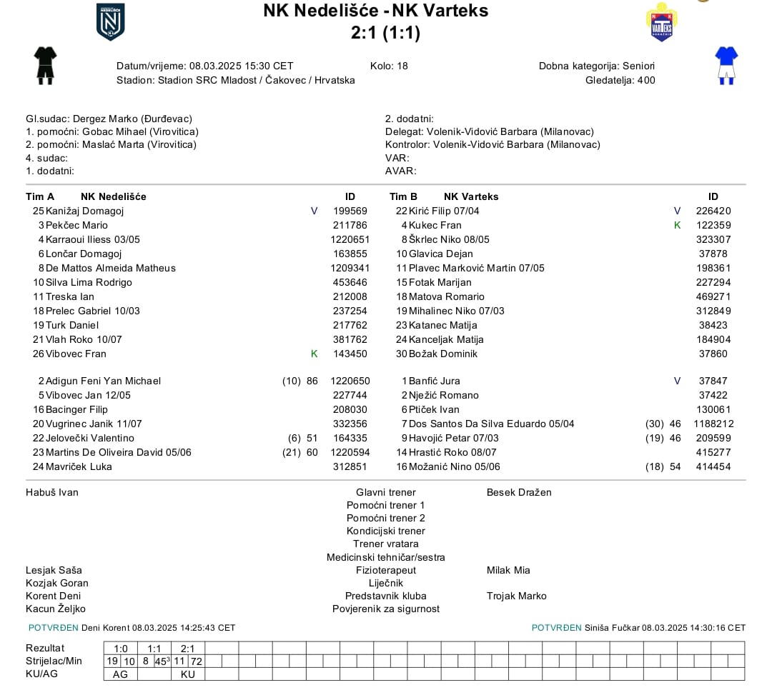 Veliku pobjedu upisalo je Nedelišće, koje nije dobro ušlo u ovu polusezonu, pobijedivši Varteks koji se nalazi na drugom mjestu. Domaćini su tako pokvarili slavlje gostujućih navijača koji su slavili svoj rođendan. Autogol je doveo Nedelišće u vodstvo, nakon što je Niko Mihalinac zatresao vlastitu mrežu. Nakon toga, Nedelišće se povuklo u niski blok i uspješno se branilo od Varteksovih prilika, sve do sudačke nadoknade kada je Niko Škrlec eurogolom poravnao rezultat. U nastavku utakmice slična priča – Varteks je kružio oko gola Nedelišća, no nije uspio postići pogodak. A onda je Ian Treska zabio pogodak za pobjedu Nedelišća.