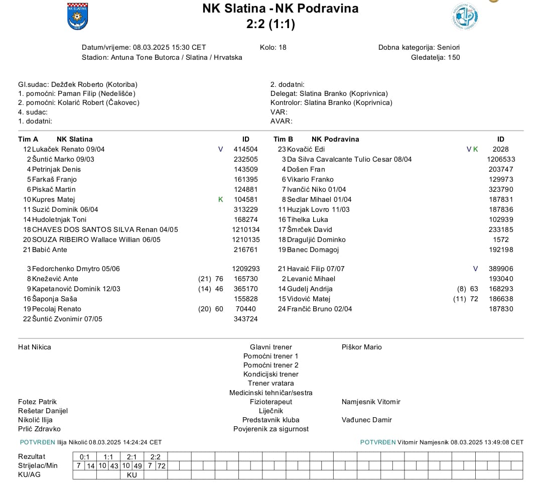 Slatina nastavlja skupljati bodove i polako se udaljava od Virovitice. Protiv Podravine na domaćem terenu došli su do novog boda. U utakmicu je bolje ušla Podravina i povela u 14. minuti preko Nike Ivančića. Gosti su nastavili dominirati i nakon tog pogotka, ali u 43. minuti domaćini poravnavaju rezultat nakon slobodnog udarca. Strijelac je bio Matej Kupres. Na početku drugog dijela, u 49. minuti, Kupres je realizirao kazneni udarac i doveo Slatinu u vodstvo. Taj gol šokirao je goste iz Podravine koji nisu uspjeli povezati svoju igru. U 58. minuti domaći igrač Franjo Farkaš dobio je crveni karton zbog odgurivanja suparnika, što je stvorilo probleme za Slatinu. Gosti su to iskoristili, a u 72. minuti Ivančić svojim drugim golom donosi bod Podravini. Do kraja utakmice gosti nisu uspjeli doći do sva tri boda.