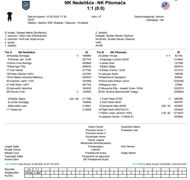 Trener Nedelišća, Ivan Habuš: “Pa prije svega moram čestitati jednoj i drugoj ekipi na fer i korektnoj utakmici koja je, pogotovo u drugom poluvremenu, bila zanimljiva i dinamična s puno događanja. Naravno da postoji žal s naše strane jer su nas sekunde dijelile do pobjede, ali opet moramo biti realni i reći da su gosti zaslužili taj gol i bod s obzirom na šanse koje su imali. Praktički bez zamjene smo odigrali ovaj susret, i kad su oni u drugom poluvremenu promijenili pet igrača, kondicijski smo teško mogli parirati i jasno je da smo teško živjeli u posljednjih pola sata. Ali mislim da su dečki stvarno ostavili srce na terenu i zbog njih mi je žao da ipak nismo izdržali. Ostala su još tri kola do kraja i teško mi je bilo što prognozirati jer nas iz kola u kolo prati nesreća i peh s ozljedama, kartonima itd. Ali opet izvlačimo maksimum i sad igramo s ekipama koje su ispod nas na tablici. Vjerujem da možemo osvojiti još neke bodove i, kad sve zbrojimo, na uspješan način završiti sezonu.”