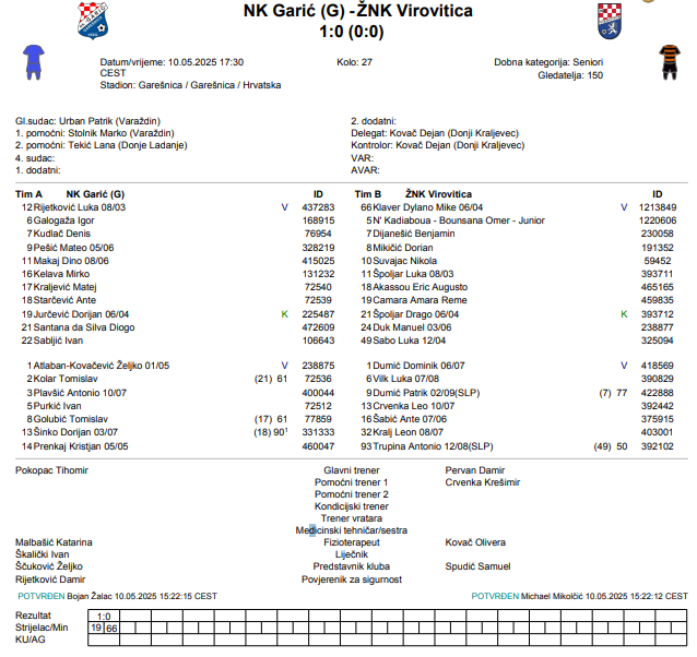 Trener Garića, Tihomir Pokopac: “U ovoj utakmici bili smo oslabljeni neigranjem Kožuhara, Diega i vratara Dubravca. Vratili smo se na prave postavke i slavili protiv nezgodne Virovitice 1:0. To su naše utakmice – tvrde, neizvjesne, borbene, s velikom dozom agresivnosti i fanatizma. Kad smo takvi, pokazalo se puno puta, onda možemo sa svakim u ligi. Ova Virovitica je dobra ekipa i trenutni položaj na tablici ne pokazuje pravi odraz njihove kvalitete. Zasluženo smo slavili i minimalno pobijedili. Bili smo bolji za taj jedan gol. Ostalo je još tri kola do kraja prvenstva i idemo to završiti na najbolji mogući način. Cijela ekipa je danas bila na visokom nivou, ali ipak, igrač utakmice je Dorijan Jurčević, kapetan u današnjoj utakmici i strijelac pobjedonosnog gola. Dodo je cijeli proljetni dio sezone u odličnoj formi, a protiv Virovitice je bio i strijelac pobjedonosnog gola. Bio sam suigrač i trener njegovom ocu i već sad, na ovom malom uzorku proljetne sezone, koliko sam mu trener, mogu reći da je učenik nadmašio učitelja.”