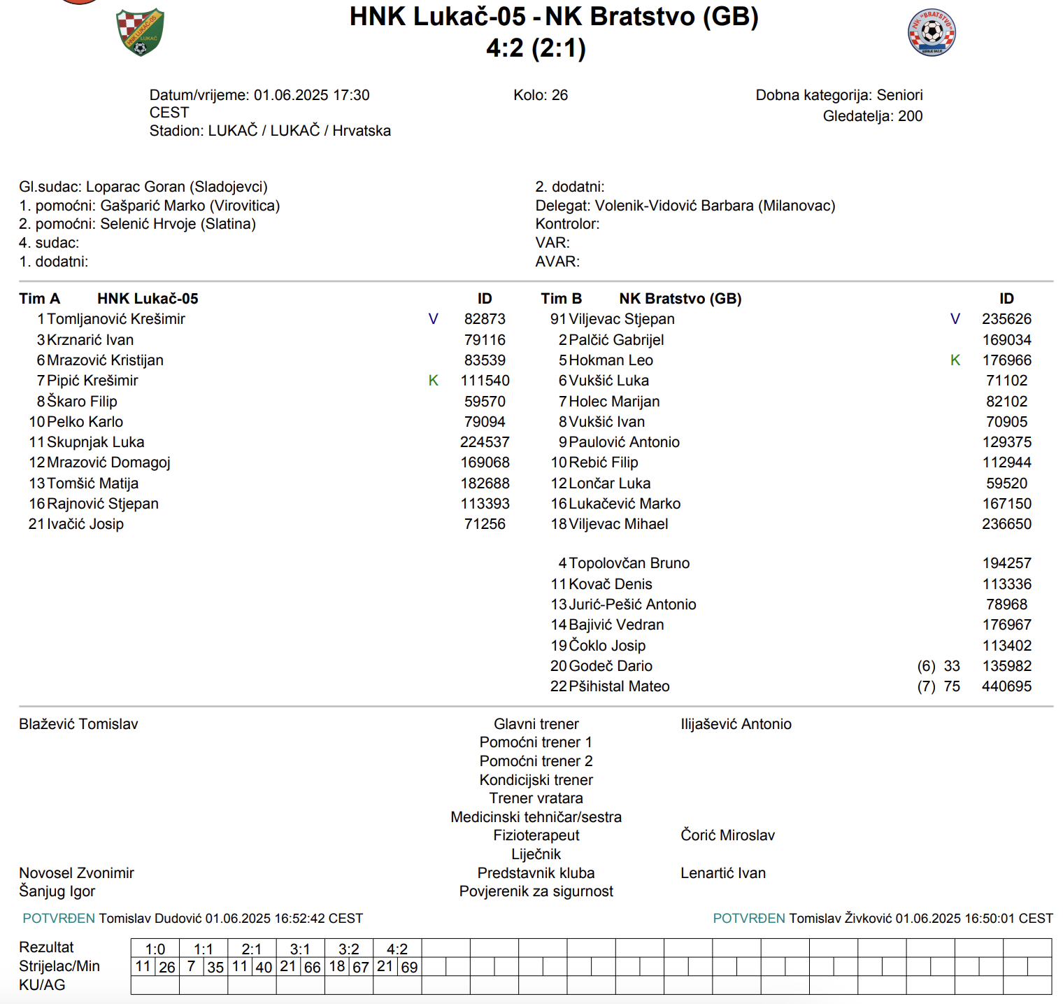 Drugoplasirani Lukač odradio je posao protiv Bratstva, ali ostaje bez naslova prvaka s obzirom da Čačinačka Mladost ima bolji međusobni omjer, a na kraju je uspjela i bolju gol-razliku izvući. Dvostruki strijelci bili su Luka Skupnjak (26’, 40’) i Josip Ivačić (66’, 69’), dok su za goste pogađali Marijan Holec i Mihael Viljevac.