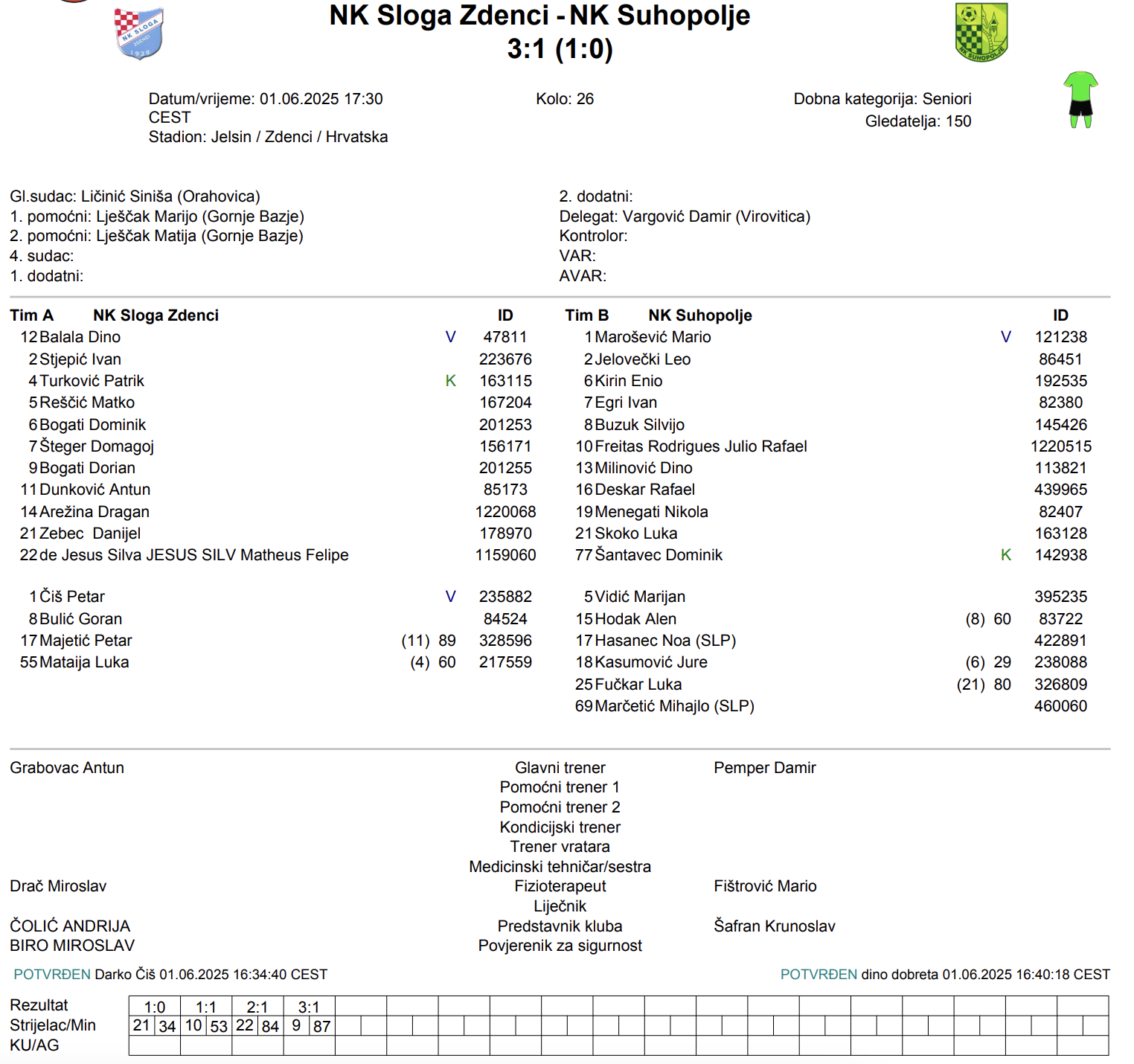 Sloga je potvrdila sjajnu sezonu i osvojila treće mjesto. Pogađali su Danijel Zebec (34’), Matheus Felipe de Jesus (84’) i Dorian Bogati (87’). Počasni gol za goste zabio je Freitas Rodrigues Julio Rafael (53’). Suhopolje završava kao četvrtoplasirano. Sloga ima najbolji napad lige te obranu dijele prvo mjesto s Mladosti iz Čačinaca. Suhopolje je odradilo također dobru sezonu, no daleko su od Sloge, Lukača i Mladosti.