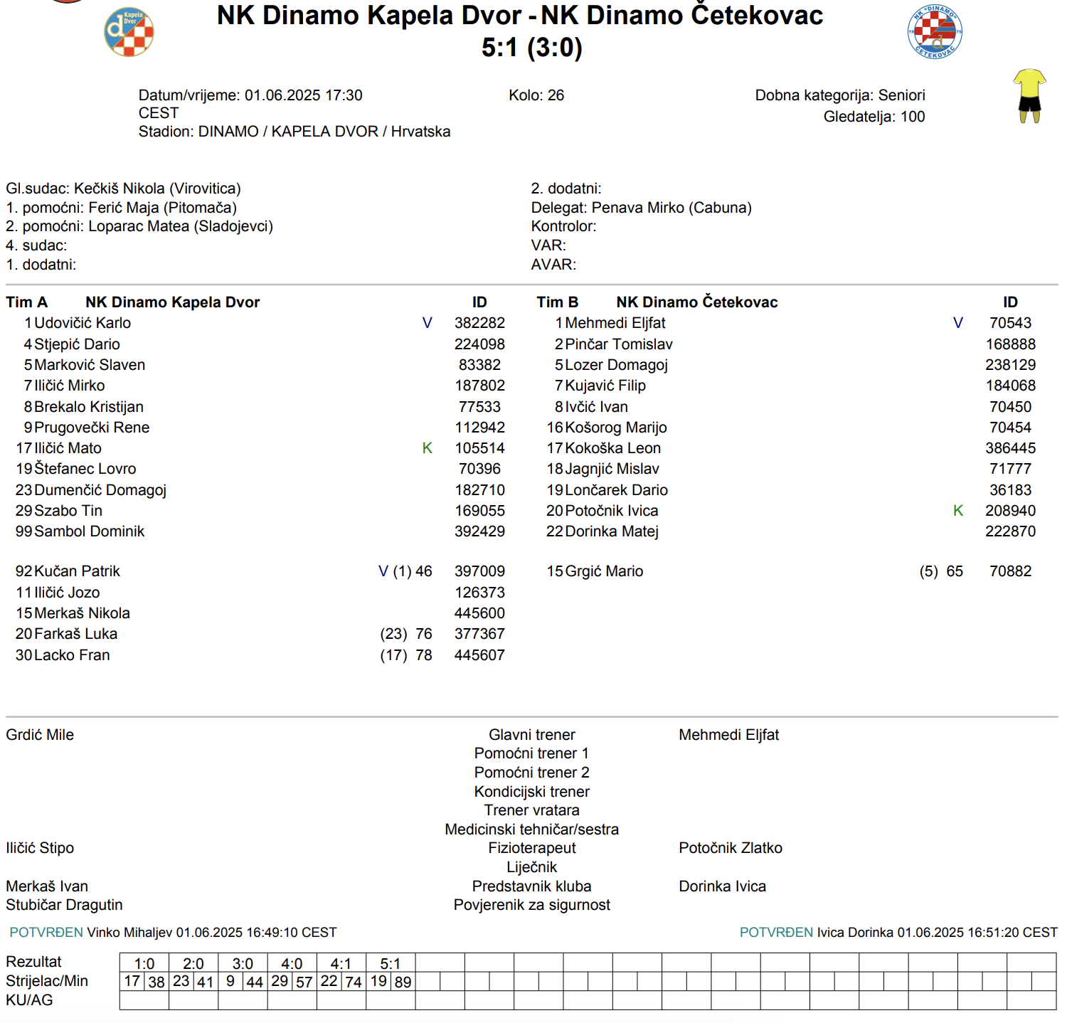 Kapela Dvor završila je sezonu na petom mjestu Premijer lige. U posljednjoj utakmici slavili su protiv svog imenjaka Dinama iz Četekovca. Utakmica je išla u jednom smjeru. Za Kapelu redom su zabijali Mato Iličić, Domagoj Dumenčić, Rene Prugovečki, Tin Szabo, Lovro Štefanec, a počasni pogodak Četekovca postigao je njihov najbolji topnik Matej Dorinka. Četekovac je završio na sredini tablice s 24 boda što i nije neki rezultat, ali je dovoljan za ostanak u ovome rangu.