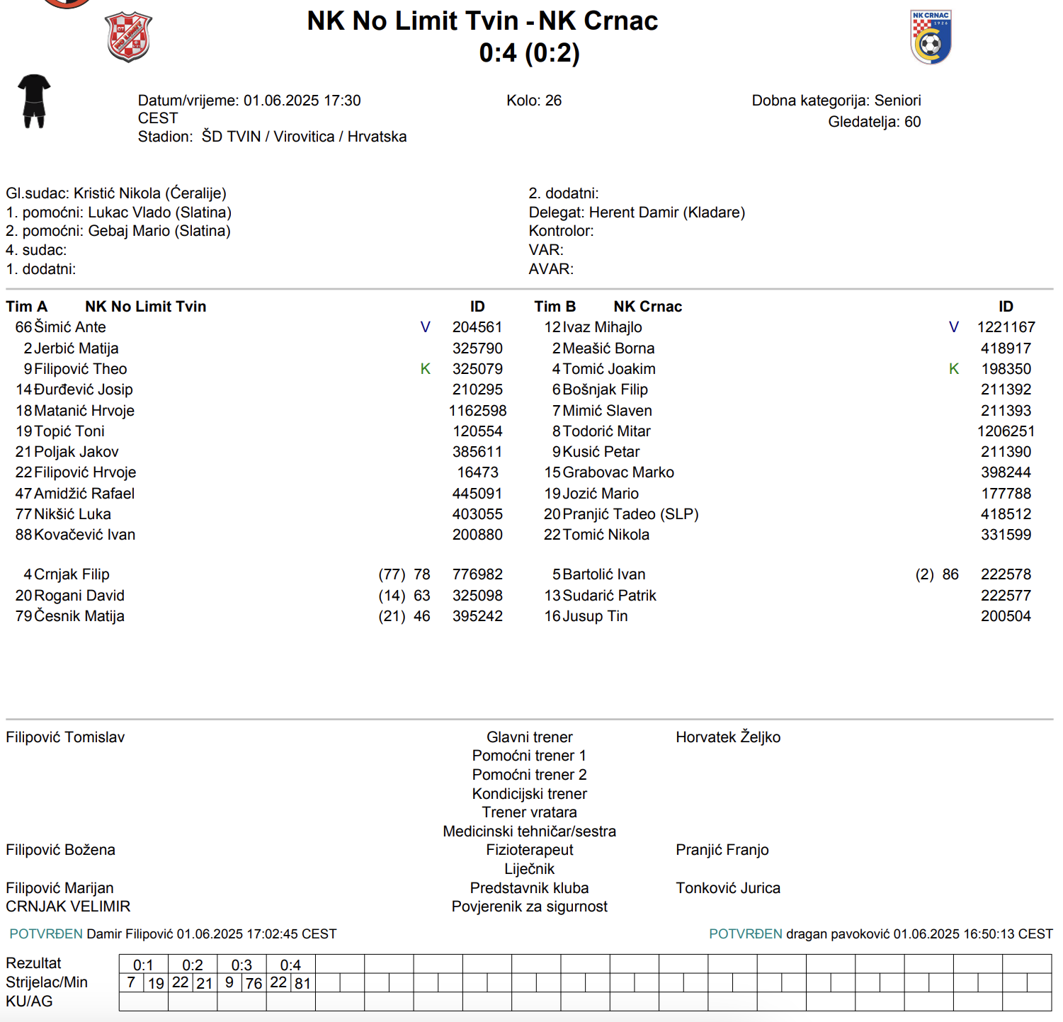 – Odigrali smo solidnu utakmicu, iako smo od 20. minute imali hendikep igrača manje. Kada izgubiš 0:4 na domaćem terenu, nekome tko nije gledao utakmicu možda čudno zvuči da je susret bio izjednačen – ali zaista je tako bilo. Iskreno sam zadovoljan većim dijelom onoga što smo prikazali. Nisam zadovoljan individualnim pogreškama u obrani koje su nas koštale primljenih golova. S druge strane, nismo iskoristili svoje prilike – dvije stative i ziceri koje je bilo teže promašiti nego zabiti. Zbog toga konačan rezultat izgleda kao da su gosti lako došli do pobjede, što ipak ne umanjuje njihovu zasluženu pobjedu. Bili su sretniji, spretniji i na tome im čestitam. Čestitam i svojim dečkima koji su ostali u premijerligaškom društvu – sada idemo dalje, graditi budućnost na našoj mladosti. Siguran sam da će im ovo biti veliko iskustvo i da će iduće sezone rezultati biti još bolji. Hvala na praćenju lige i na svemu što radite za sport u našem kraju. – prokomentirao je Tomislav Filipović, trener No Limita.
