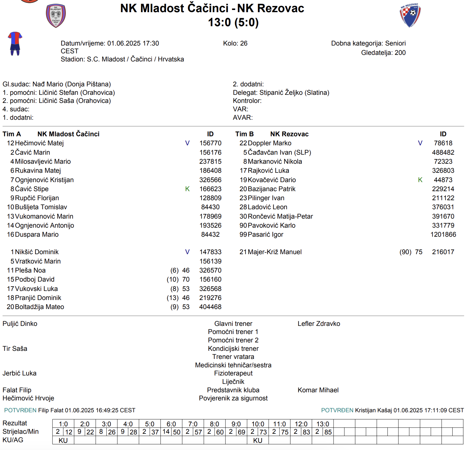 Očekivana pobjeda Mladosti na domaćem terenu za obranu naslova prvaka Premijer lige. Od početka se igralo samo na jednoj polivci i tako je bilo do kraja utakmice. Rezovac je zaprijetio na gol domaćina ravno 0 puta, na prste možemo nabrojati koliko su uopće gosti i prešli puta centar. Marin Čavić briljirao je s čak 9 pogodaka (12’, 37’, 57’, 60’, 69’, 73’, 75’, 83’, 85’) koji je kasnio za vodećim strijelcima lige Felipeom i Milinovićem, ali je u ovoj utakmici sve nadoknadio i prestigao ih. U ovoj sezoni postigao je 31 gol i tako je najbolji strijelac lige, dok je iza njega Felipe s 29 i Milinović s 28 pogodaka. Pobjednik se znao od samog početka, a cijela ekipa je dala sve od sebe da pomognu Marinu da dođe do titule najboljeg strijelca lige. Društvo Marinu su radili Florijan Rupčić s dva (22’, 28’), Štipe Čavić (26’) i Antonijo Ognjenović (50’). Rezovac je ovim porazom potvrdio ispadanje iz lige.