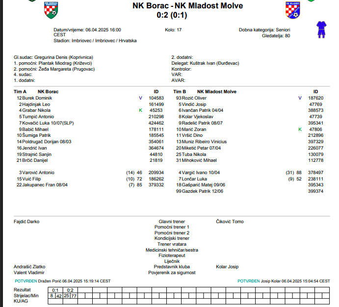 Borac se i dalje nalazi u ozbiljnoj rezultatskoj krizi, a novu priliku za bijeg s dna iskoristila je Mladost Molve, koja je u Imbriovcu odnijela sva tri boda – za goste su pogađali Vjekoslav Kolar u 42. i Nikola Tuba u 77. minuti, čime su Borcu nanijeli novi poraz.