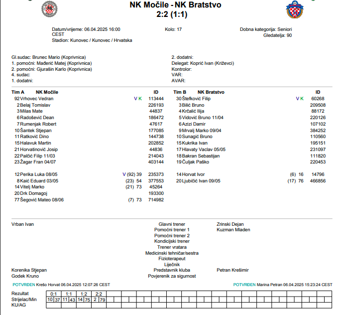 U Kunovcu su Močile ugostile Bratstvo u uzbudljivoj utakmici koja je završila bez pobjednika, iako su gosti poveli u 37. minuti pogotkom Brune Sunagića; samo šest minuta kasnije domaći dolaze do izjednačenja preko Dine Ratkovića. U drugom dijelu Bratstvo ponovno dolazi do prednosti kada je u 75. minuti precizan bio Ivor Horvat, no njihovo vodstvo nije dugo trajalo jer je već u 79. minuti Tomislav Belaj donio vrijedan bod Močilama u borbi za ostanak u ligi.
