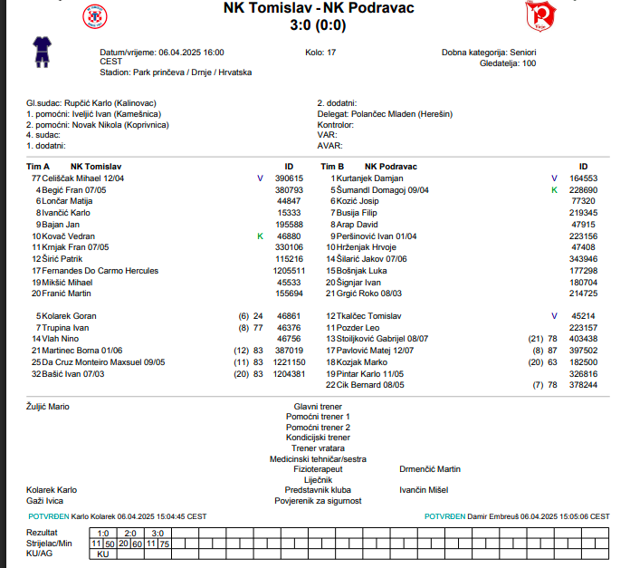 “Prvo poluvrijeme utakmica je bila dosta izjednačena. Ni mi ni protivnik nismo realizirali šanse. Drugo poluvrijeme smo ušli puno odlučnije i napravili potpunu dominaciju na terenu trkom, disciplinom i šansama. Čestitam svojim dečkima na top izvedbi!” – izjavio je Mario Žuljić, trener Tomislava.