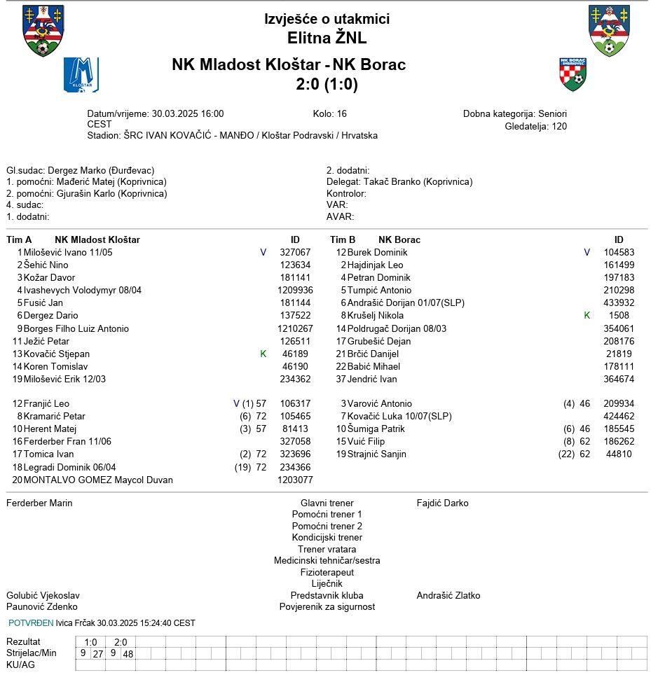 U Kloštru Podravskom Borac iz Imbriovca nije uspio pronaći odgovor na inspiriranog Brazilca Luiz Antonio Borges Filhoa u redovima domaćeg tima. Njegovi pogoci u 27. i 48. minuti osigurali su Kloštru zasluženu pobjedu i puni plijen.