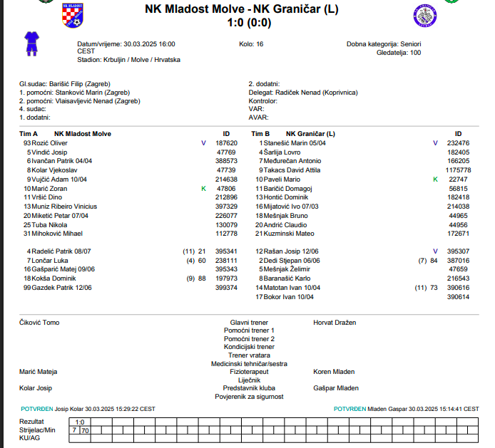 “Zaslužena pobjeda domaćina. Više su željeli pobjedu, bili su bolji u duelima, a mi se okrećemo sljedećoj utakmici.” – izjavio je Dražen Horvat, trener Graničara.