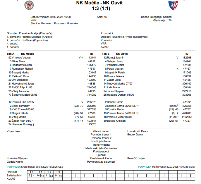 Močile su briljantno otvorile utakmicu protiv Osvita, vodeći već u prvoj minuti golom Deana Radoševića. Ipak, pred kraj prvog poluvremena gosti izjednačuju rezultat. U drugom dijelu Osvit preuzima inicijativu te golovima Luke Zlatara i Patrika Lopatnika odnosi sva tri boda iz Močila.