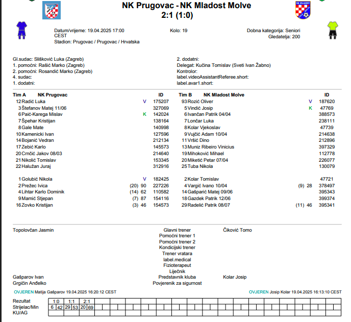 “Derbi donjeg doma. Teška utakmica, ali s prilikama s obje strane na teškom terenu. Borba i želja mojih igrača ipak su došle do izražaja, pa smo konačno iskoristili svoje prilike. Slijedi nam daljnja borba za ostanak, ali uz ovakvu želju i htijenje vjerujem da to možemo izboriti. Čestitam svojim momcima, a gostima želim svu sreću u nastavku prvenstva. Na kraju bih pohvalio sudačku trojku koja je odradila svoj posao besprijekorno.” – prokomentirao je Jasmin Topolovčan, trener Prugovca.