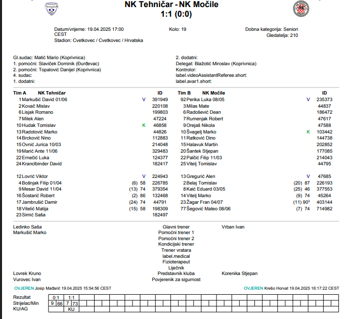 Vodeći Tehničar dočekao je Močile, a prvo poluvrijeme prošlo je bez pogodaka. U nastavku su gosti poveli preko Nikole Orejaša, ali Alen Milak je u 73. minuti precizno realizirao kazneni udarac, donijevši domaćinu izjednačenje 1:1. Veliki bod za Močile u borbi za ostanak!