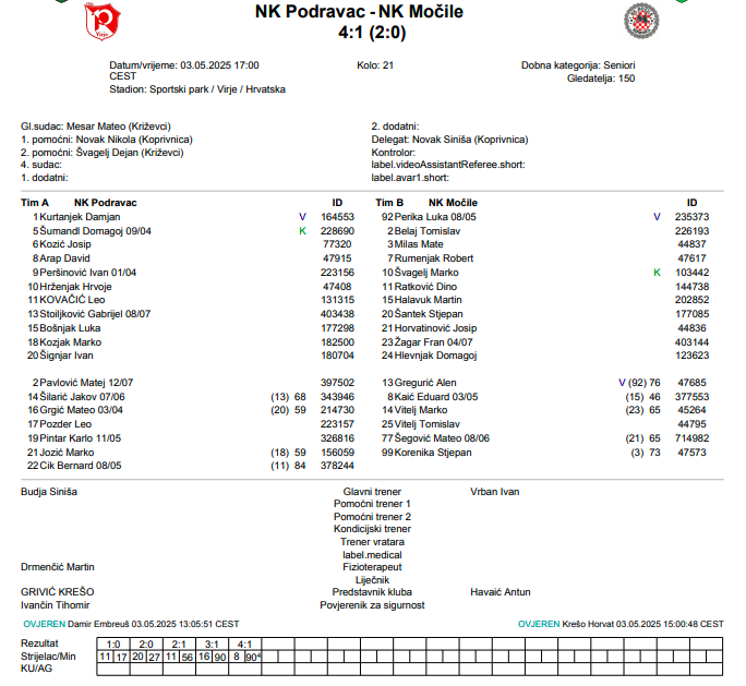 “Ekipi prvo čestitam na dobroj utakmici. Od samog početka vidjela se razlika u kvaliteti, poluvrijeme završavamo s dva nula i sve izgleda odlično. Ulazak u drugo poluvrijeme je u drugoj brzini, gosti smanjuju lijepim golom na 2:1. Zatim slijedi revija naših promašaja, ali ipak na kraju uspijevamo zabiti još dva i mirno privesti utakmicu kraju. Močilama želim sreću do kraja prvenstva.” – dodao je Siniša Budja, trener Podravca.