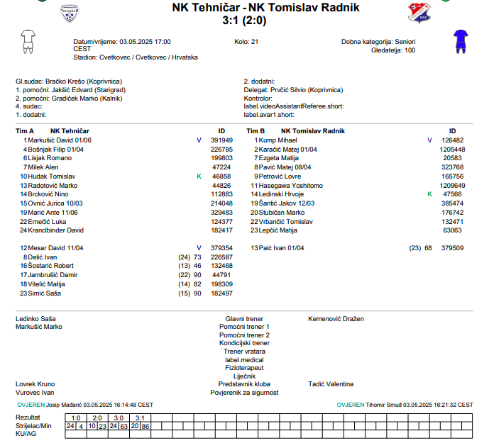 “Odlično otvaramo utakmicu i vodimo 2:0, držimo igru pod kontrolom, no dobivamo crveni karton i stvaramo si nervozu. Gosti su odlična ekipa i vrlo korektno su odradili utakmicu. Nama su najvažnija tri boda i okrećemo se kup utakmici s Koprivnicom.” –  izjavio je Kruno Lovrek, trener Tehničara.