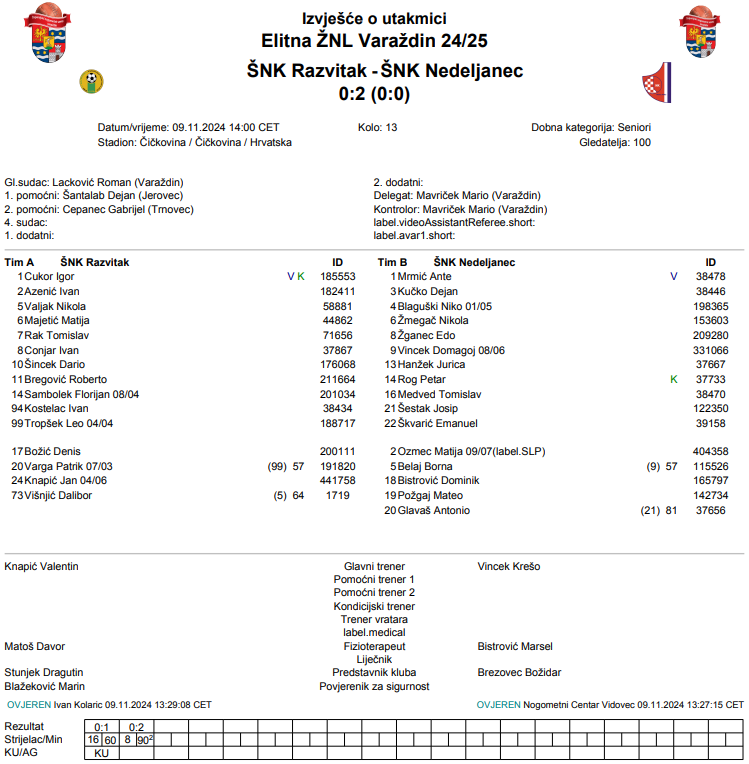Nedeljanec je ponovno bio koban za Razvitak, ali ovoga puta u Čičkovini. Izjednačenu utakmicu gledali smo u prvih sat vremena, a onda je Tomislav Medved doveo Nedeljanec u prednost pogotkom s bijele točke. Nakon toga je utakmica otišla u stranu gostiju, a novi pogodak postigli su na samom kraju utakmice. Razvitku je ovo četvrti poraz u sezoni, ali će ostati trećeplasirani i nakon trinaestog kola jer im današnji protivnik zaostaje samo bod pred kraj prvog dijela sezone.