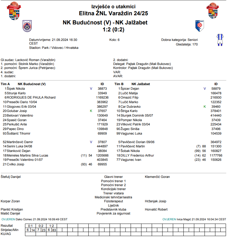 Budućnost je s novim trenerom na svom stadionu dočekala Jalžabet i izgubila. Niko nema konkretan odgovor kako zaustaviti momčad Gorana Klemenčića jer i nakon šestog kola ostaju neporaženi. Filip Omazić i Marko Lučić su ranim pogocima u prvih 20 minuta utakmice osigurali respektabilnu prednost gostiju. Tim rezultatom otišlo se na predah, a u nastavku su gosti dobro čuvali rezultat. Budućnost je svoje prilike unovčila tek u 83. minuti preko Richarda de Paule. Nije to bilo dovoljno makar za bod iz ove utakmice, ali je prikazana igra podloga treneru Štefulju za rada s novom momčadi.