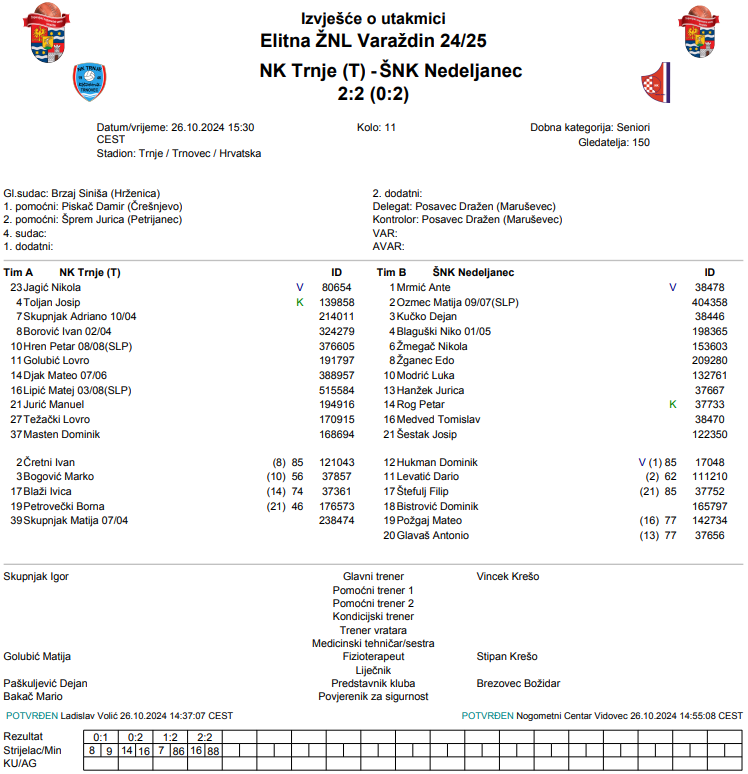 Nogometaši Trnja na svom terenu dokazano igraju dobro, a to su potvrdili i današnjom utakmicom protiv Nedeljanca. Iako je počelo sjajno po goste, završilo se bolje po domaći sastav. Edo Žganec i kapetan momčadi Petar Rog doveli su goste u rano vodstvo jer je Nedeljanec već do 16. minuta imao prednost od 0:2. Ipak, kako je u osvrtu rekao trener Trnja: „nogomet se igra 90 minuta“, pa su nogometaši Trnja do boda ipak došli u samoj završnici utakmice. Prvo je Adriano zabio u 86. minuti, a samo dvije minute kasnije Matej Lipić je svojoj momčadi osigurao bod iz ovog susreta.