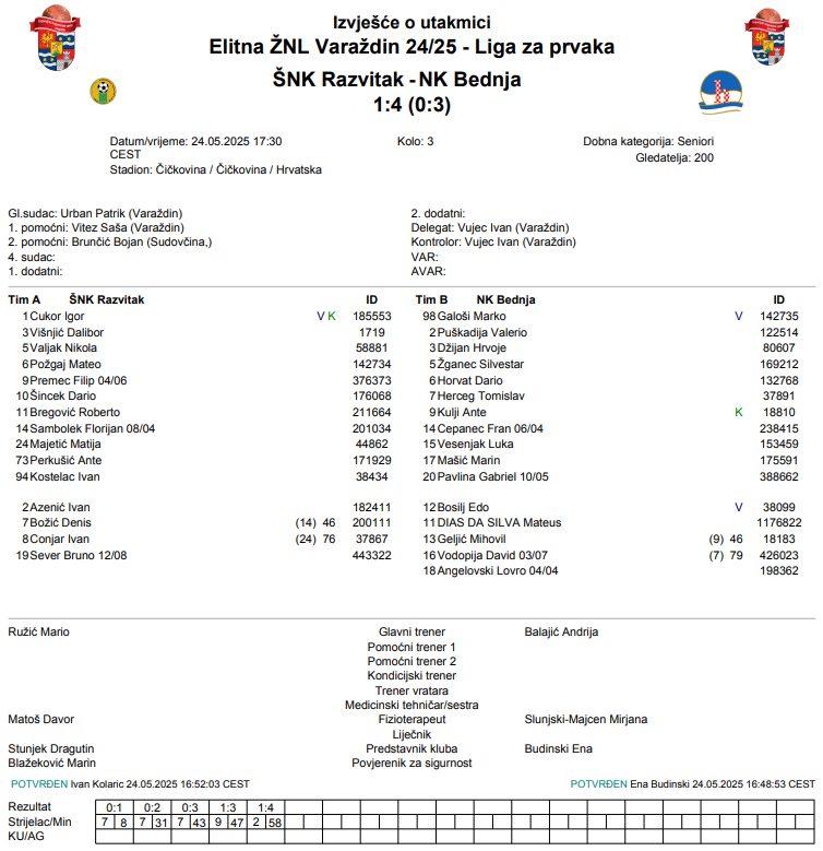 Nakon iscrpljujuće utakmice u srijedu u kup utakmici protiv Varteksa bojao sam se da će nas umor spriječiti da odigramo jednu dobru utakmicu. Ali moji igrači su opet pokazali karakter i odigrali fantastično. Tri pogotka u prvom poluvremenu su već riješila pitanje pobjednika. Drugo poluvrijeme je bilo odrađivanje “posla” i da se sto manje potrošimo. Zaslužen pobjeda moje momčadi. Domaćinu sve čestitke na fer i korektnoj igri i iskrene zahvale cijeloj momčadi sto su nam prije početka utakmice napravili špalir u znak osvajanja prvenstva– Andrija Balajić, NK Bednja.