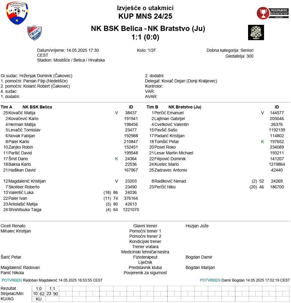 U drugom polufinalnom susretu, BSK je zadržao prednost iz prvog susreta i remijem protiv Bratstva zakazao nastup u finalu. Prvi dio utakmice protekao je bez većih uzbuđenja, no u nastavku su se momčadi rastrčale i podigle tempo igre. Domaćini su poveli u 62. minuti, kada je Robin Zanjko bio precizan s bijele točke i doveo BSK na prag finala. Gosti iz Jurovca do pogotka su stigli tek na kraju susreta kada je Niko Perčić poravnao rezultat na 1:1, ali to nije bilo dovoljno za preokret. BSK je tako ušao u u finale Međimurskog kupa nakon 35 dugih godina, a kruna uspješne sezone je i osiguran nastup u pretkolu hrvatskog kupa.