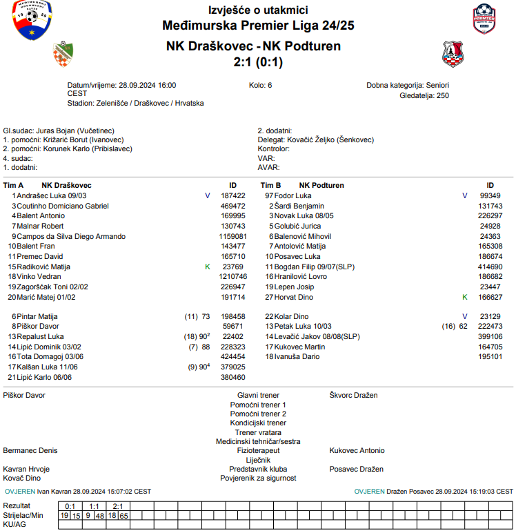 Draškovec je nakon preokreta pobijedio goste iz Podturena. Pred velikim brojem gledatelja na Zelenišću su sačuvali sva tri boda. Krenulo je bolje za goste koji su poveli pogotkom Josipa Lepena koji je iskoristio grešku domaćih igrača u 15. minuti utakmice. Na radost domaćih navijača najbolji strijelac lige Diego je na početku drugog dijela poravnao rezultat na 1:1, a 65. minuti uslijedio je potpuni preokret kada je Vedran Vinko zabio za 2:1. U nastavku su gosti iz Podturena promašili dvije izgledne prilike pa je rezultat ove žive i borbene utakmice ostao na strani Draškovca.