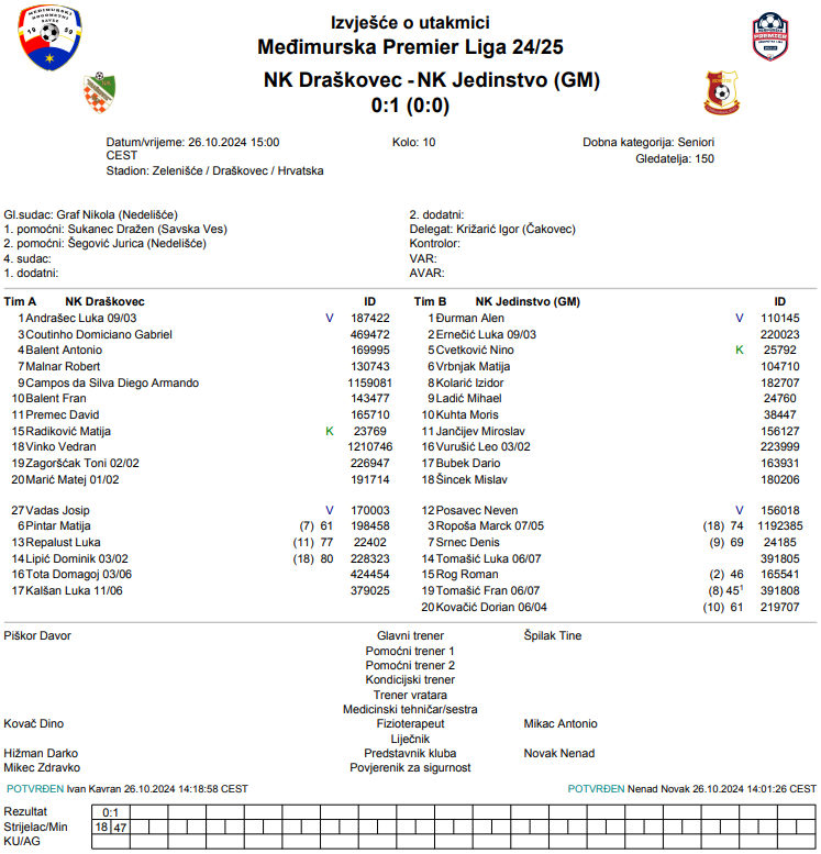 Jedinstvo je u Gornji Mihaljevec ponijelo sva tri boda iz Draškovca. Minimalnim rezultatom pobijedili su domaćina na Zelenišću. Jedini pogodak za Jedinstvo djelo je Mislava Šinceka na startu drugog dijela. Domaćoj je momčadi sportska sreća danas okrenula leđa pa su utakmicu na kraju morali završiti s 10 igrača jer je Balent isključen pred kraj utakmice.