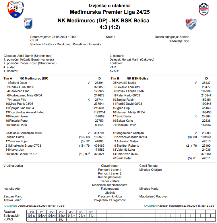 Utakmica je odlična uvertira u novu sezonu Premier lige i utakmica za sve gledatelje! Postoji veliki žal za izgubljenim bodovima, pogotovo nakon preokreta i vodstva na poluvremenu! Iako smo poraženi kod aktualnog prvaka, veoma sam zadovoljan igrom svojih igrača. Prikazali smo nogomet koji želimo igrati, a kad smanjimo greške na minimum bit ćemo još bolji i atraktivniji. Pozivam i dalje gledatelje da budu podrška ekipi kao što su i danas bili. Htijenje i zalaganje za igrom i bodovima ove ekipe je neosporno. Mi se već okrećemo novom izazovu u međimurskom kupu ove srijede gdje idemo u goste novom članu Premier lige NK Kraljevčanu 38′ – osvrnuo se na večerašnju utakmicu trener BSK-a Kristijan Mihalec.